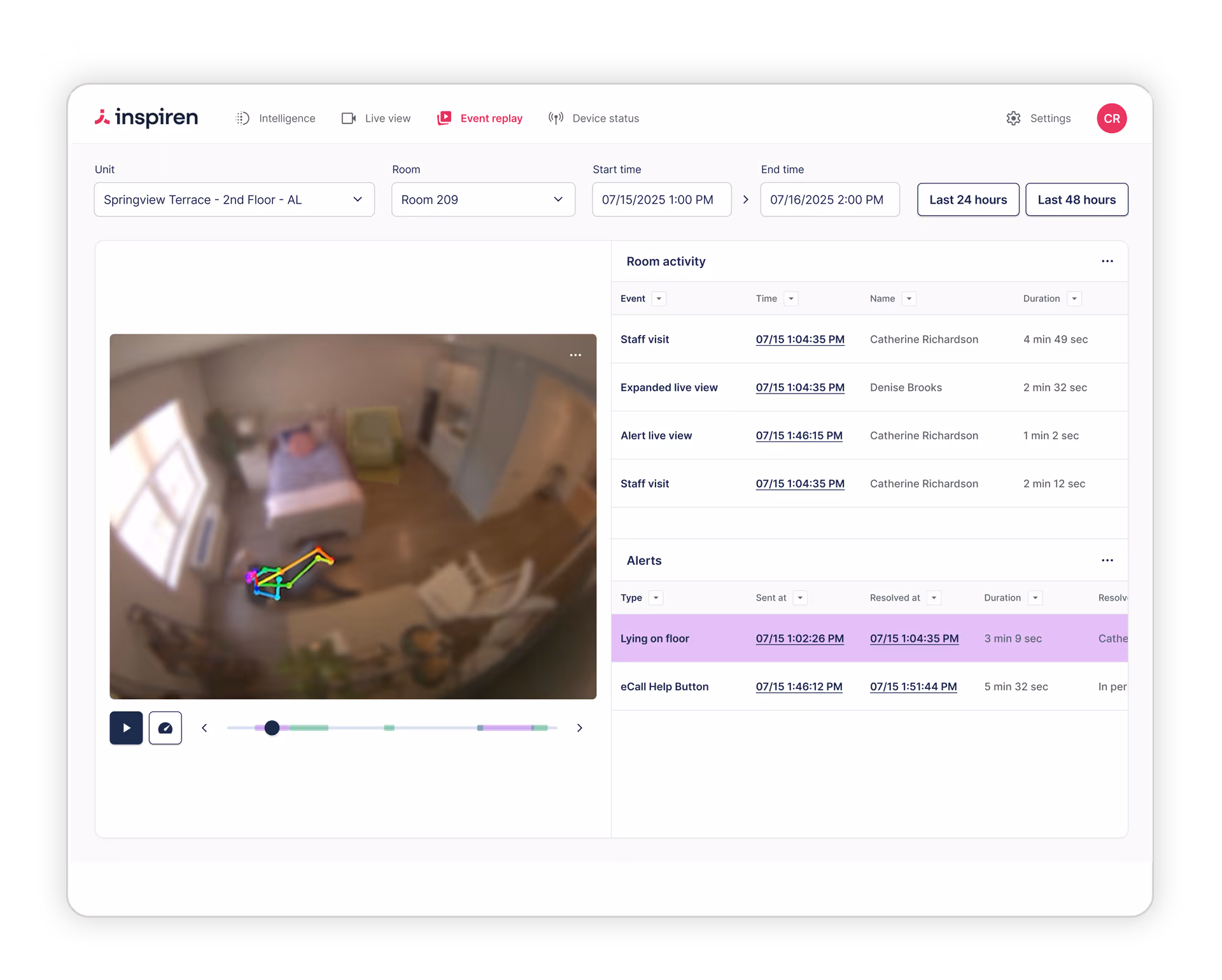 Review incidents with clarity. Replay events like falls or unusual activity to understand what happened, why, and how to prevent it.