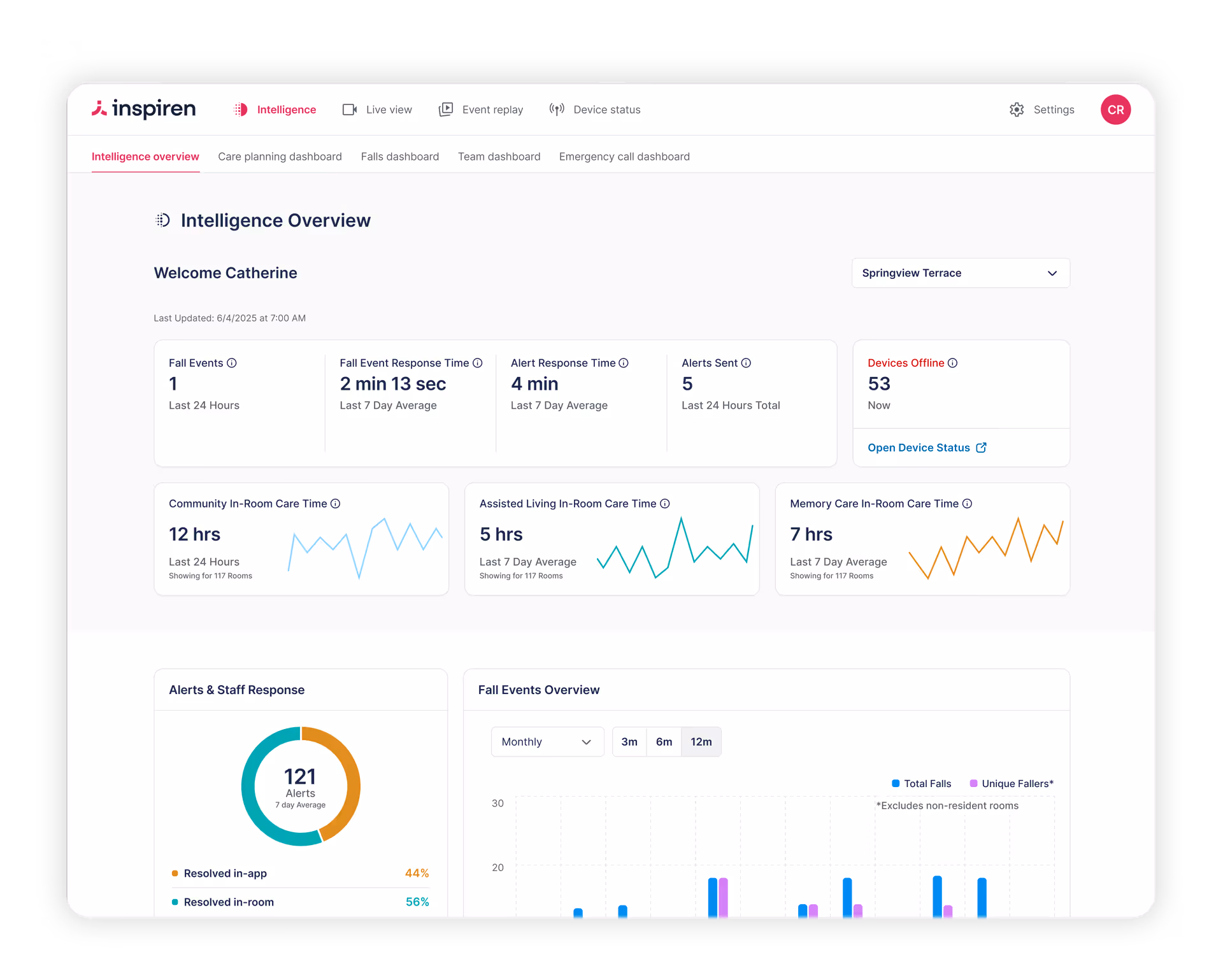 Inspiren integrates seamlessly into our business intelligence platform. Powerful, real-time insights help us deliver care more efficiently and proactively identify when residents need additional support.